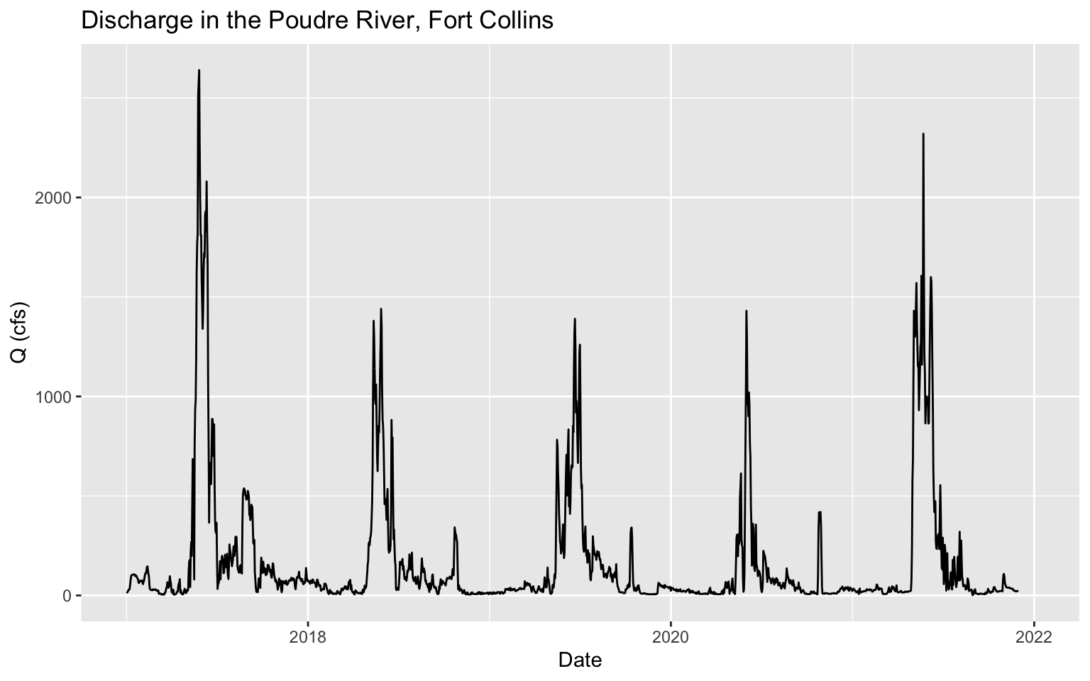 The Poudre River runs through northern Colorado, passing through Fort Collins, CO. In this assignment, we look at the the annual discharge of the river to determine annual patterns and severe weather events.
